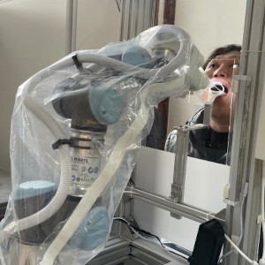 Tras escanear la identificación de la persona a analizar (su DNI), realiza la toma de la muestra, vía nasal. Para ello, está conectado a un operario que, mediante la ayuda de un sistema de visión, guía el brazo robótico para que pueda extraer cómodamente la muestra sin provocar daños a la persona sometida a examen.