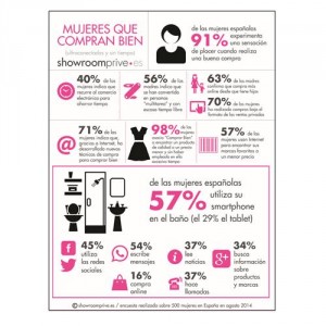 La Digital Woman y la Digital Mum españolas: sin tiempo libre, siempre ocupadas e híper conectadas a Internet para ahorrar tiempo y dinero Las mujeres españolas han de hacer frente a multitud de obligaciones por lo que se han convertido en personas “multitarea” que compaginan el trabajo fuera del hogar con el cuidado de la casa (y de los niños en el caso de la Digital Mum), organización del ocio familiar, toma de decisiones financieras, etc. Así, según los datos que se desprenden del estudio “Showroomprive Smart Shopping Satisfaction 2014”, realizado a un total de 500 “Digital Women” en España, el 49% de las mujeres españolas indica que cuenta con escaso tiempo libre y se han convertido en personas “multitarea”, cifra que aumenta hasta un 56% en el caso específico de las Digital Mums.