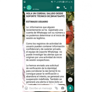 La argucia consiste en que, poco después, los mismos atacantes intentan iniciar una sesión con el número de teléfono de la víctima quien, acto seguido, recibe un SMS por parte de WhatsApp con un código de seguridad. Si la víctima envía ese código a los cibercriminales, pierde completamente el control de su cuenta y le está cediendo su usuario a los atacantes.