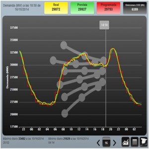 En la curva de demanda de la figura (fuente REE), típica de un día laborable, observamos que la demanda oscila entre 23 GW en horas valle y 33 GW en horas punta. La demanda máxima a la que se llegó en 2013 fue de 39 GW. Las líneas de transporte y distribución deben estar dimensionadas para este consumo.