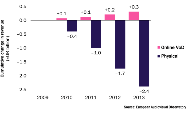 Figure 1: Cumulative change in revenue for physical and online video rental services, Europe, 2009–2013